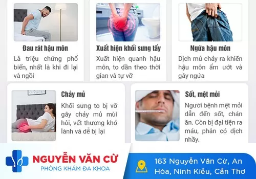 Xuất hiện các khối cứng sưng đỏ ở hậu môn, dễ bị vỡ và chảy dịch vàng hôi.